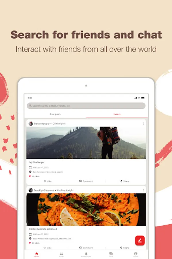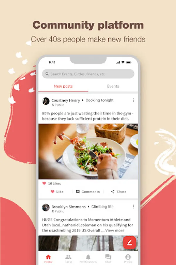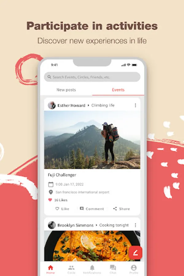 - Search social circles, events, and posts