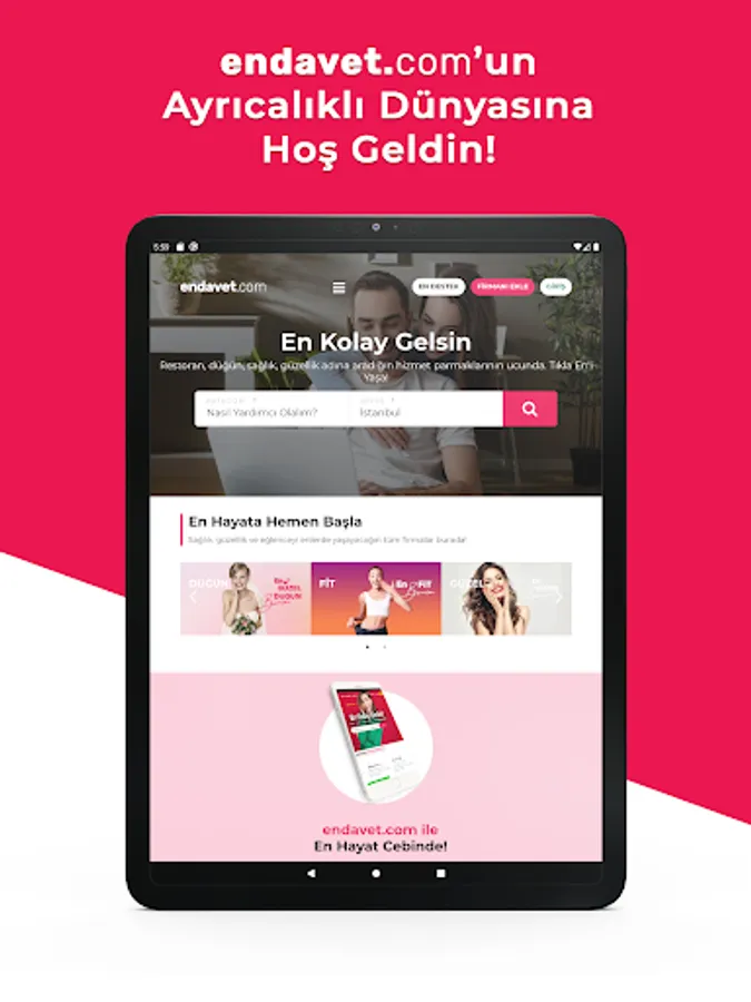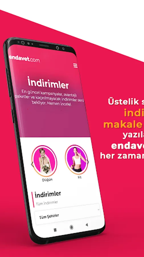 You will be able to find many services you are looking for on endavet.com, which serves all of Turkey! With the categories of Sports and Health, Beauty, Wedding and Venue, dietitian, gym, personal trainer, beauty center, plastic surgery doctors, as well as wedding halls, wedding dress shops, rental bridal cars, restaurants, cafes, entertainment venues, everything is just the application of this application. hidden inside!