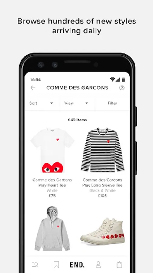 END. curates a world-leading menswear brand roster including Saint Laurent, Comme des Garçons, Off-White and Stone Island alongside hard-to-find sneakers from Adidas, Nike, Jordan, New Balance and Common Projects. Browse latest arrivals, discover break-through brands and explore the latest trends with our slick, quick and easy-to-use app for Android.