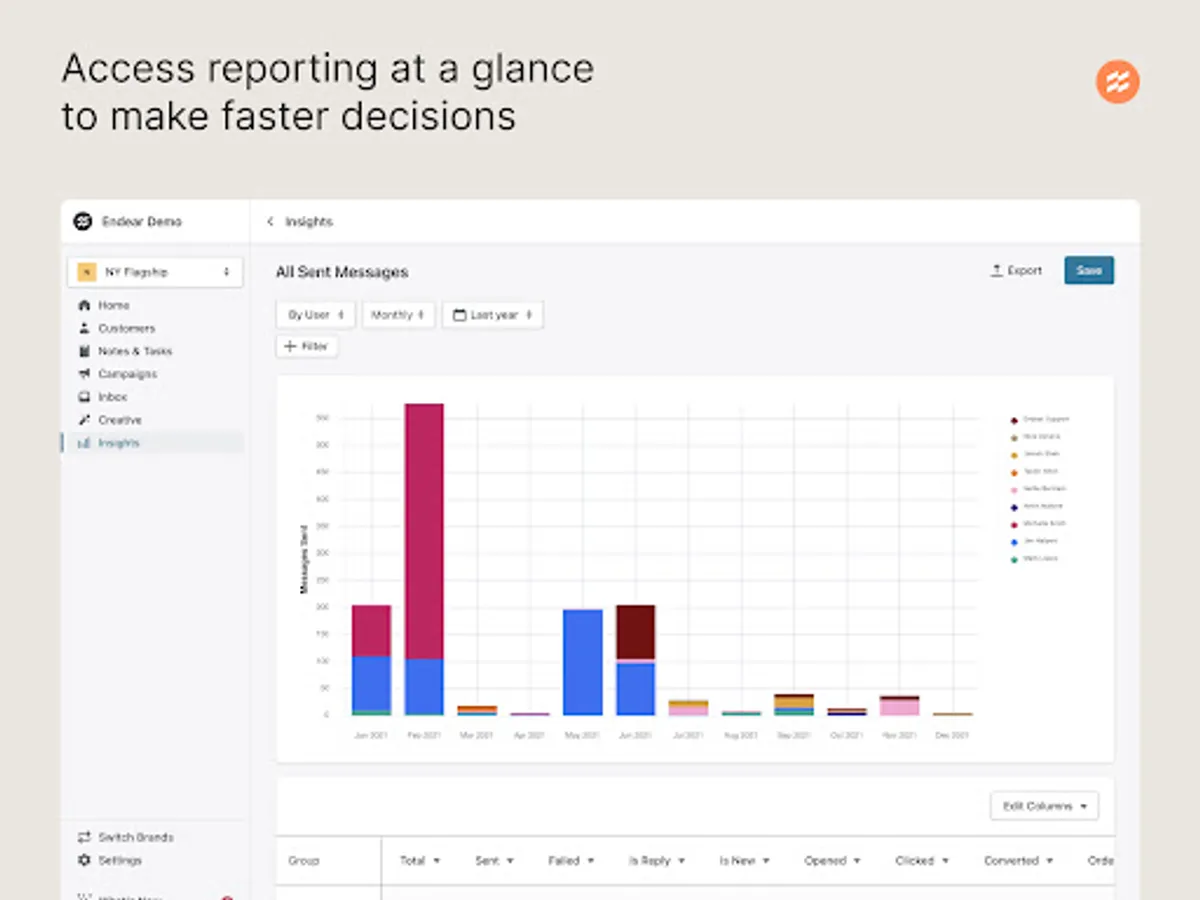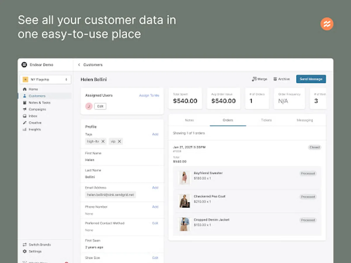 Endear easily connects with one click to offer a live feed of customer order history, data, and product inventory. Organize and manage your customer data using filters like average order value, last item purchased, and zip code so you're always targeting the right customers with the right message.