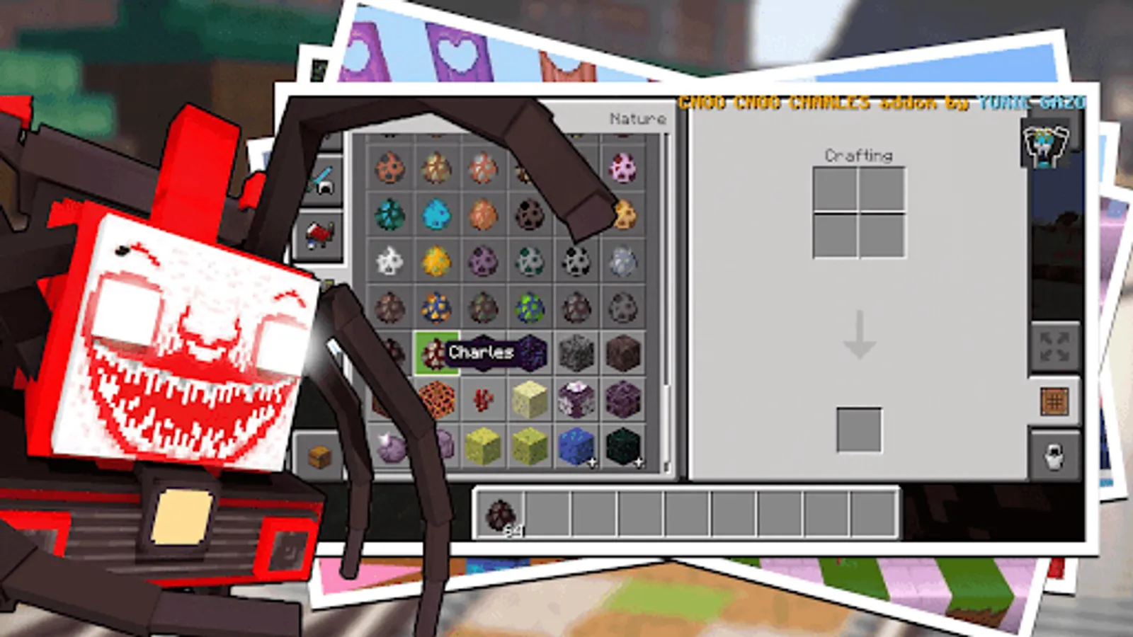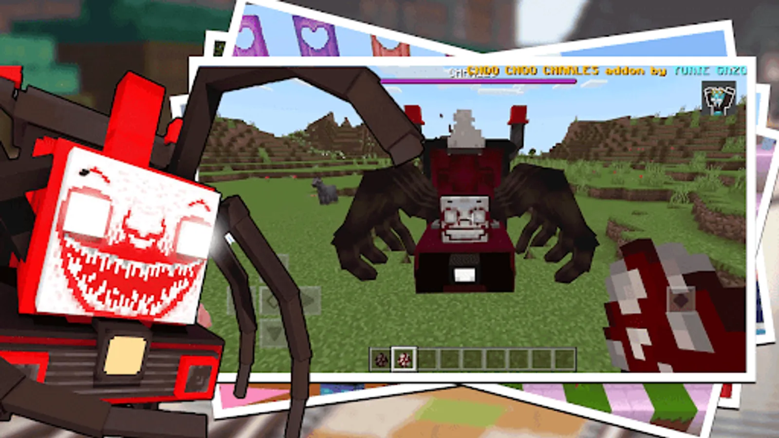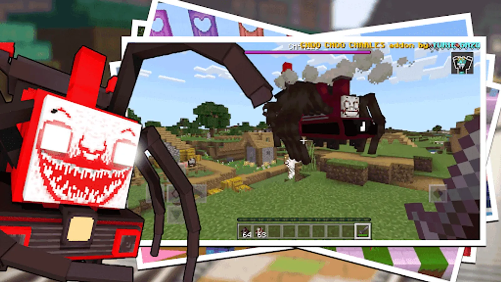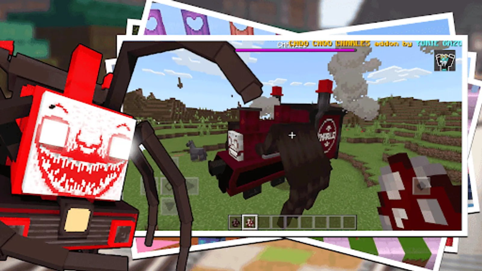 Challenge yourself with the project choo choo charles adventure in survival mode for choo choo charlie terror for your mcpe world, this choo choo charles companion is a demonic train monster that really makes everyone curious. You can prove the power of Choo Choo Charles Old Train by fighting with other MCPE mobs, and you will be able to see who among Choo Choo Charles Evil Spider Train and other mobs is the strongest. Prove it in your mcpe world by using this choo choo charles mod for mcpe.