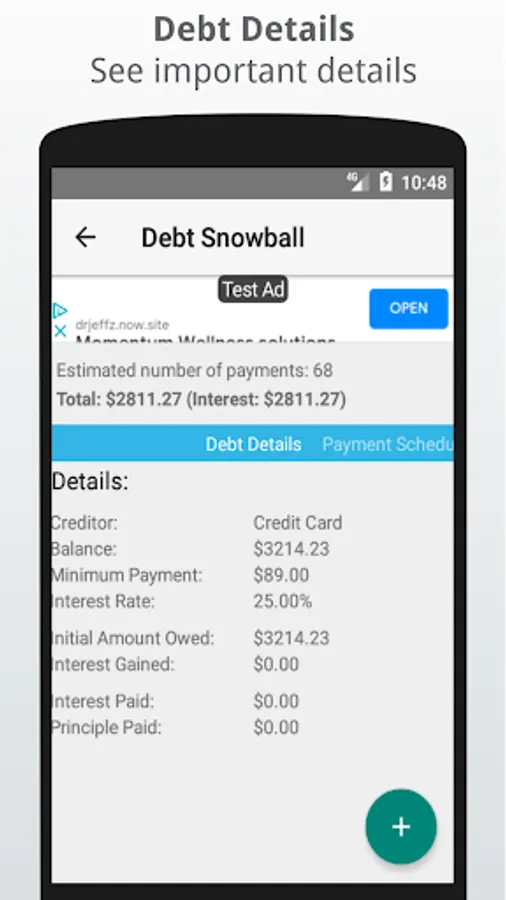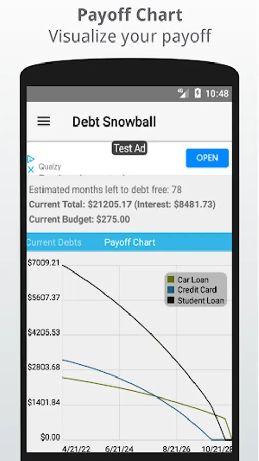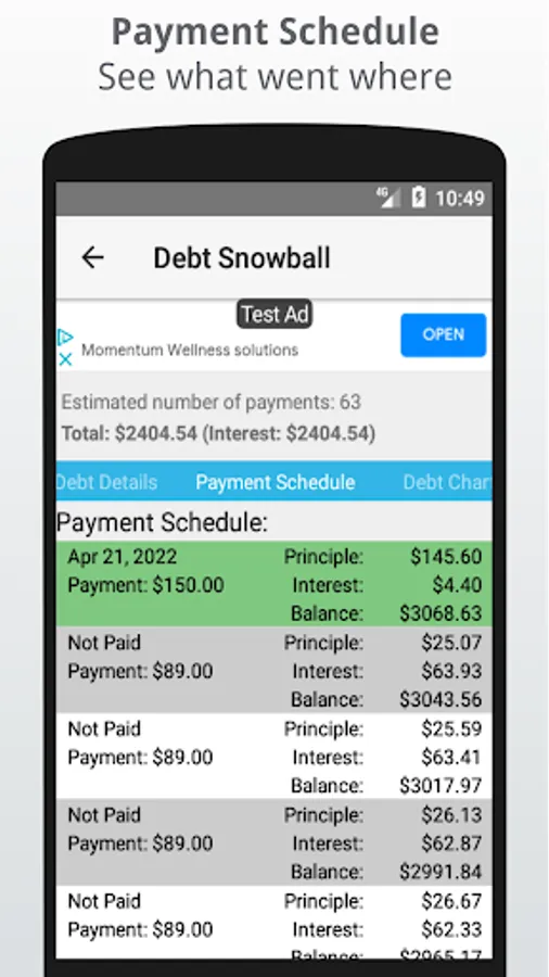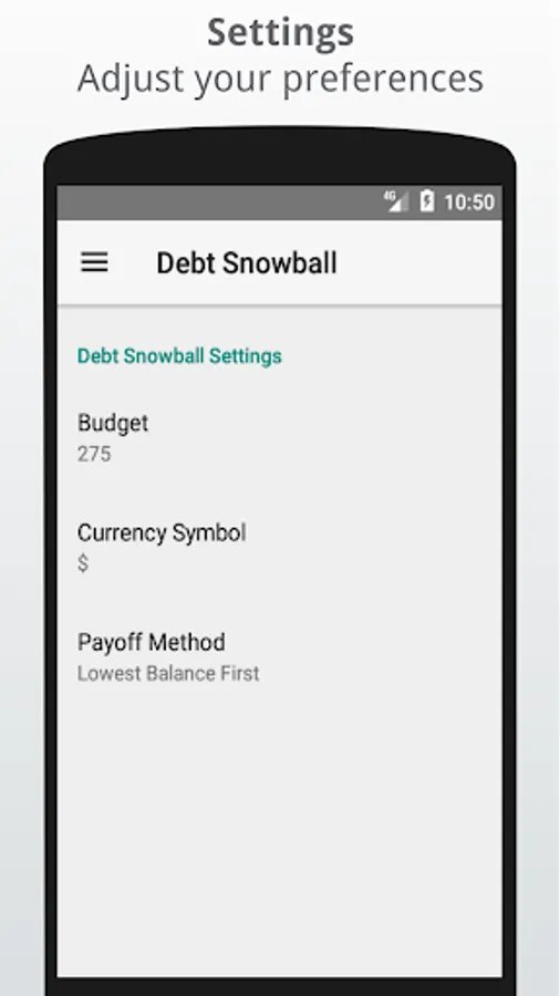 Get rid of that pesky debt hanging around. Use the Debt Snowball method to rid it in no time! With this app you can record your debts and payments to see how much time you have left. Click on a debt to view its details such as: Interest Gained, Principle and Interest Paid, Amortization Schedule based on previous payments and future payments. You can adjust your monthly budget to see how overage payments decrease that time significantly. Three different payoff methods are available. The lowest balance first (Snowball Method), highest interest rate first (Avalanche Method), and highest minimum payment method.