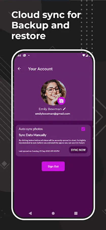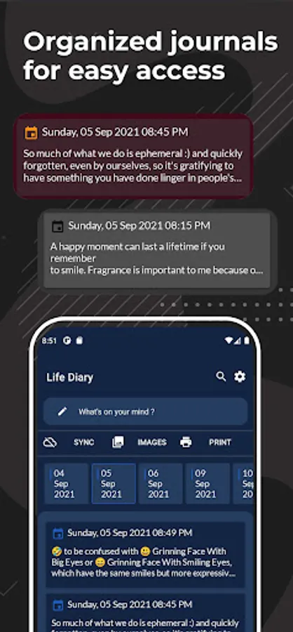 Syncing allows you to backup your data safely in the drive. Never miss any data and journals. You can access all your journals and memories if you change your device.