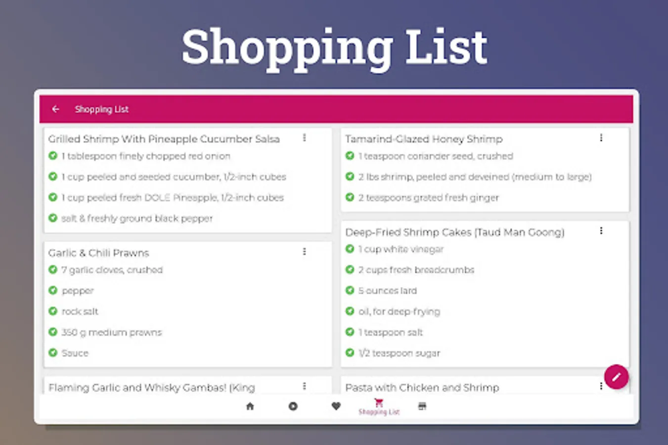 Shrimp recipes app let you manage all your favorite recipes and shopping list offline.