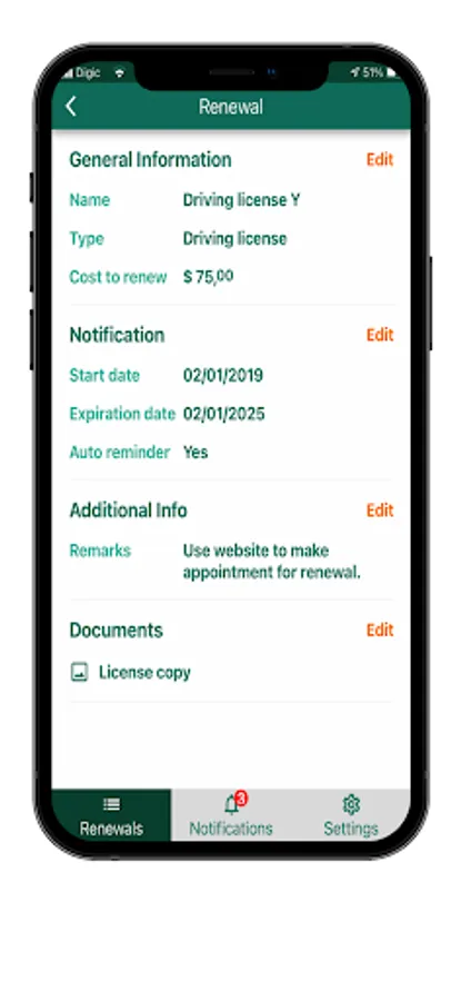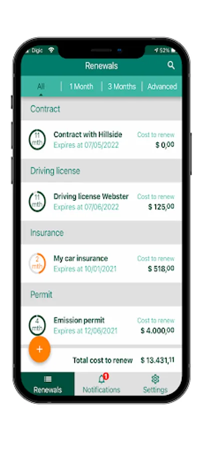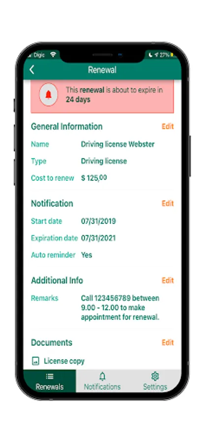 With this handy app you can store all your important papers offline in your mobile phone. Driving license, permits, subscriptions, contracts, certificates, insurances and many more. This app will inform you when a document is about to expire. This makes it easy for you to keep track of all expiration dates for well-timed cancellations and renewals, saving you time, money and avoiding unpleasant situations when a document expires without you knowing.