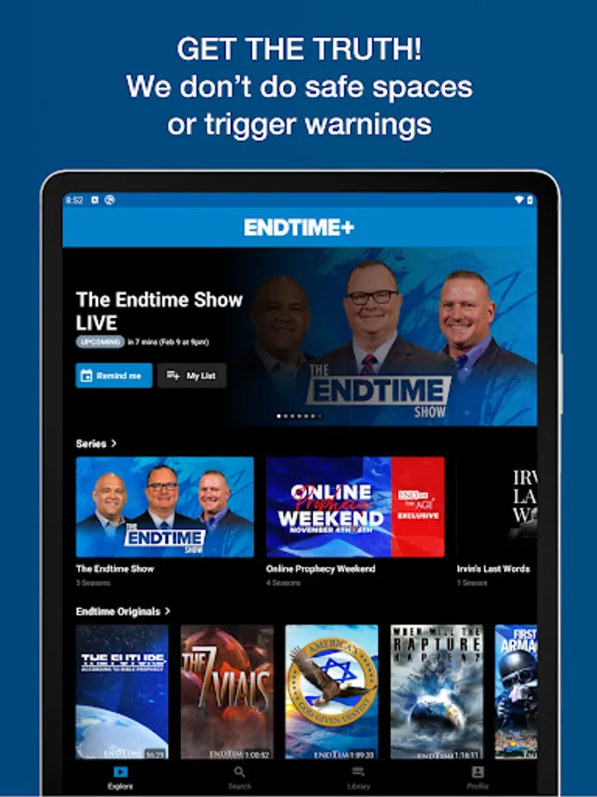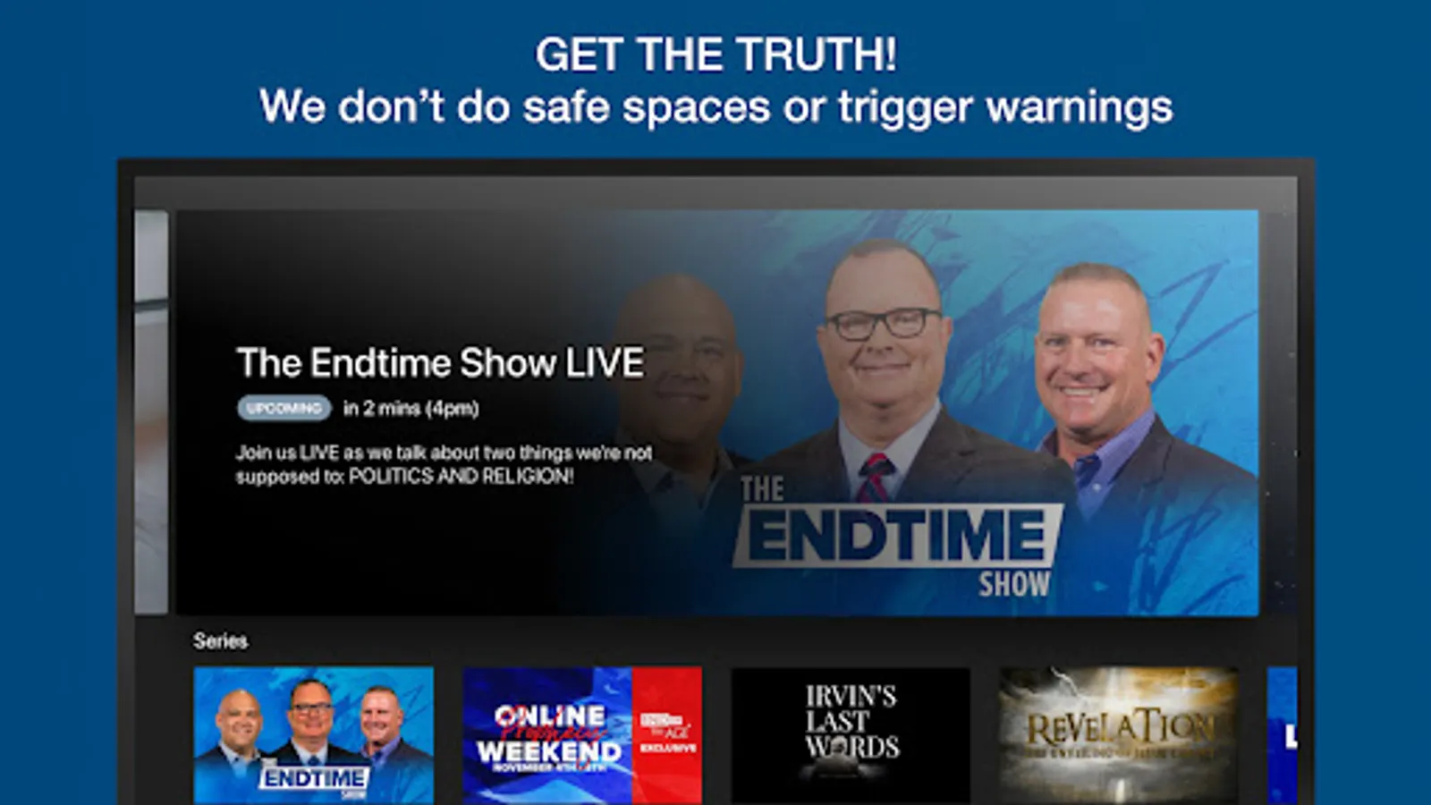GET THE TRUTH! We don't do safe spaces or trigger warnings. Become a subscriber to join the largest prophecy streaming service in the world. EXCLUSIVE CONTENT! Access all broadcasts from Endtime Ministries with Irvin Baxter and Dave Robbins and our full show library. PLUS get exclusive content for Endtime+ members ONLY!