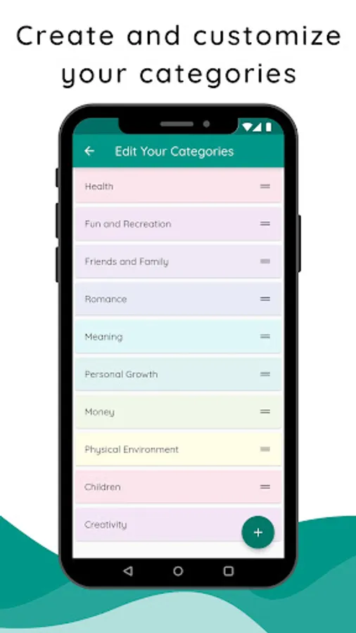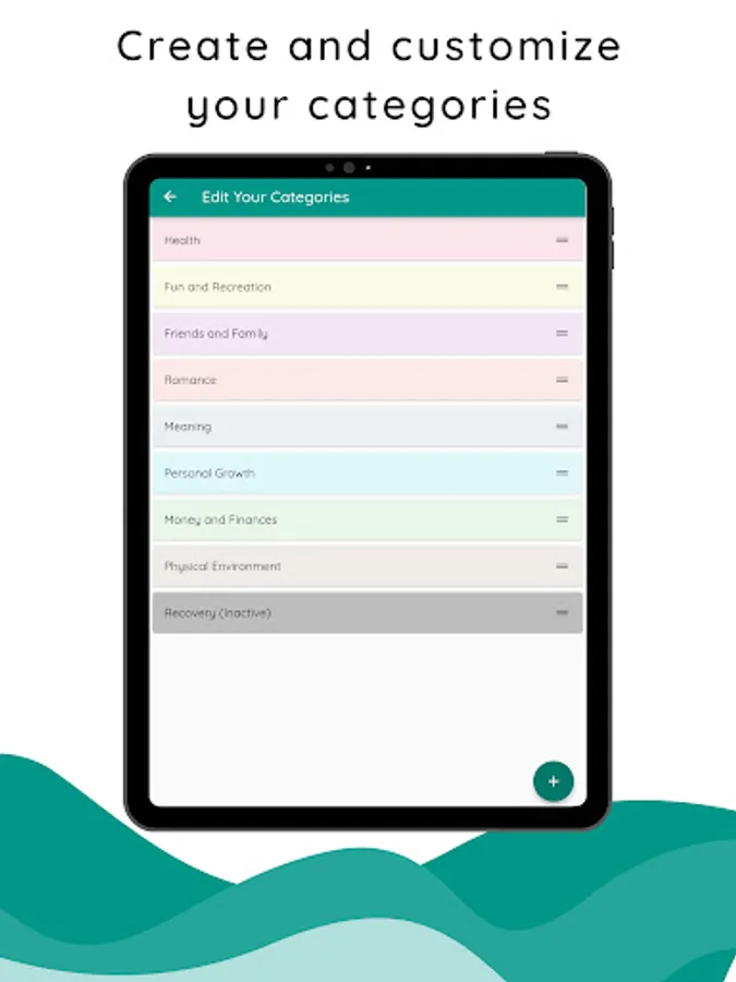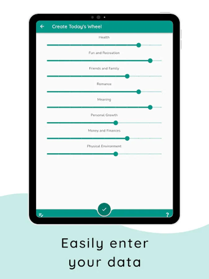 Enter how you're feeling about important parts of your life: relationships, money, recreation, physical space, love, and anything key to your well-being.