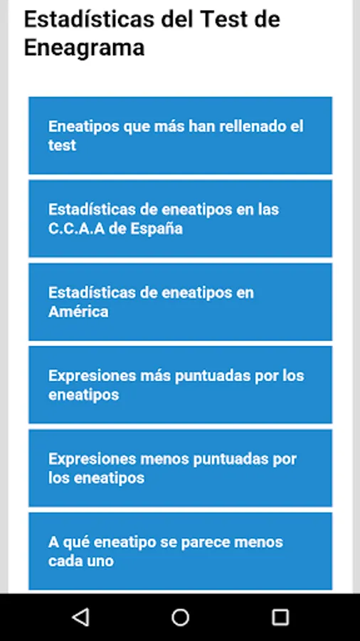 You will also see different statistics according to the results of more than 40,000 tests: the assertion highest points per enneatypes, autonomous communities of Spain or American countries where there are more average each enneatypes, distribution map of each enneatypes maps ratio each enneatypes in America or in Spain ...