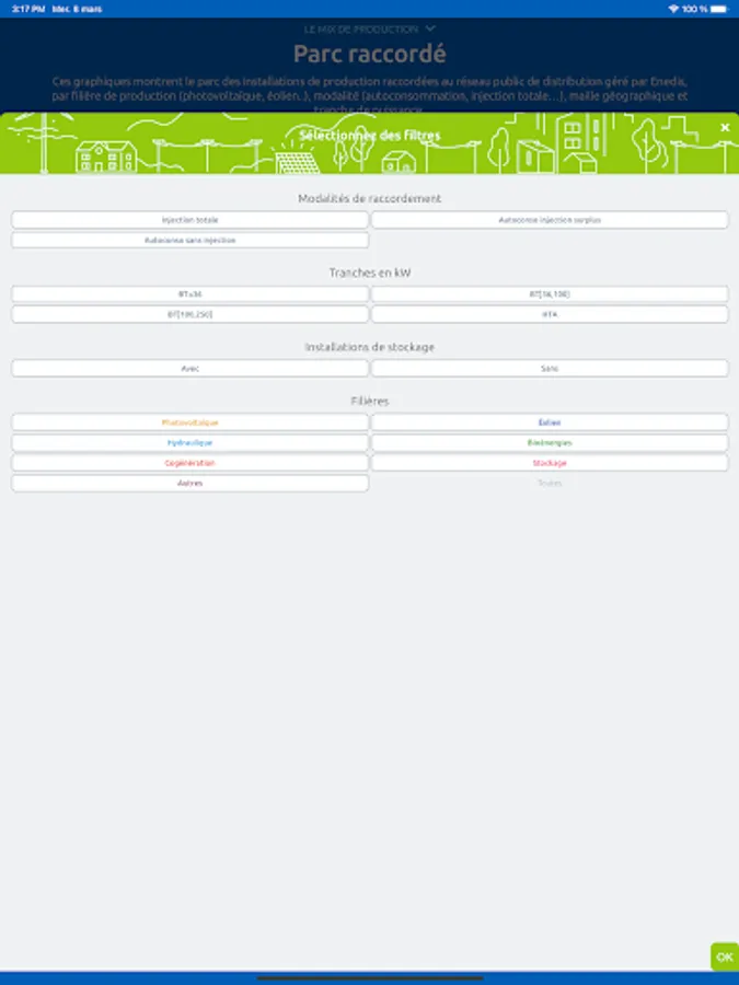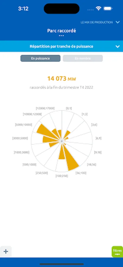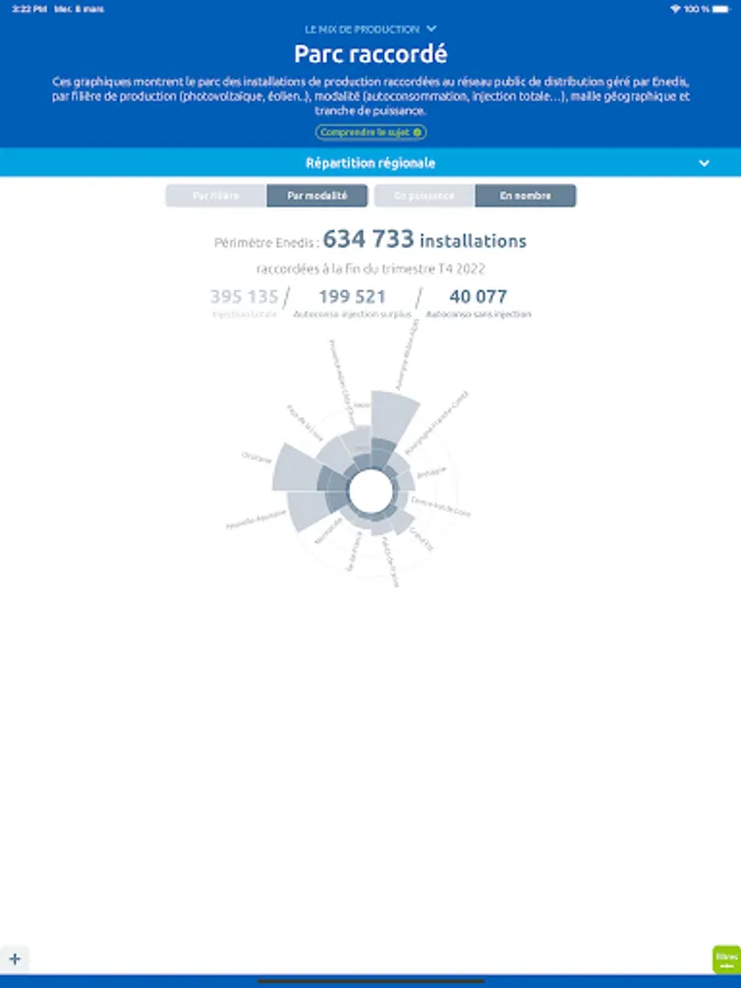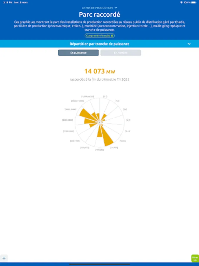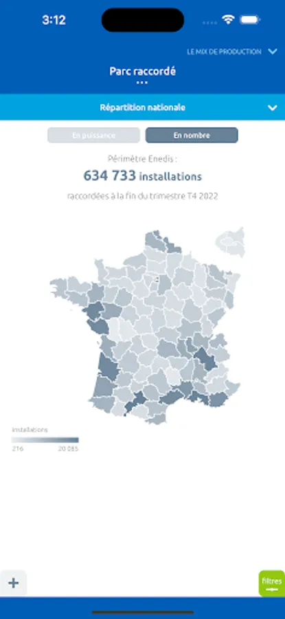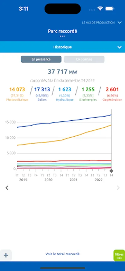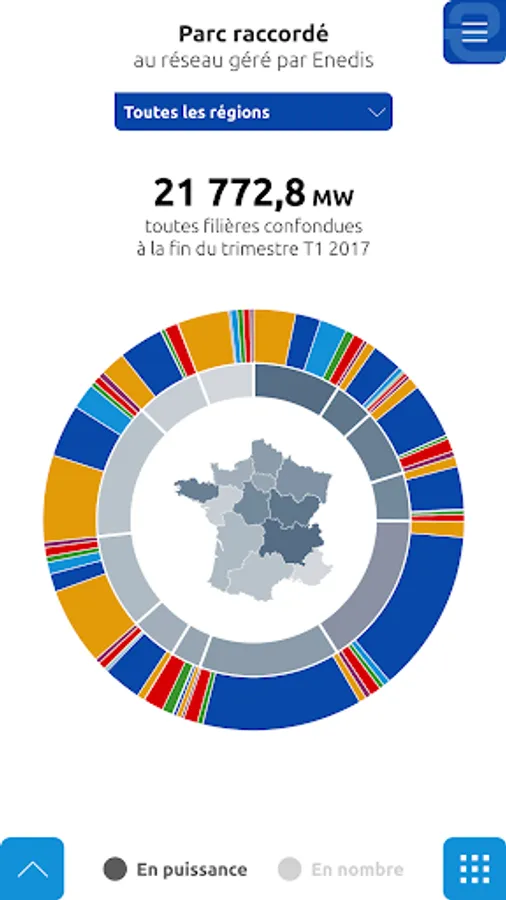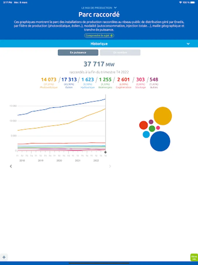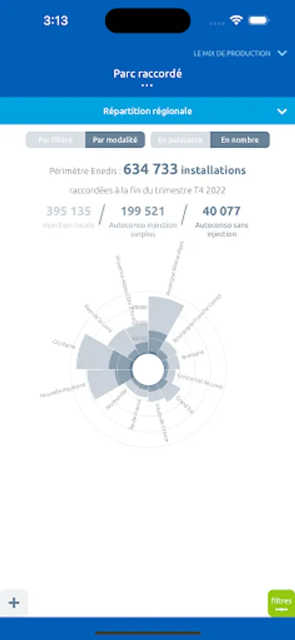 The panorama of the production facilities shows the number and power of the connected systems or being connected to the public distribution network managed by Enedis.