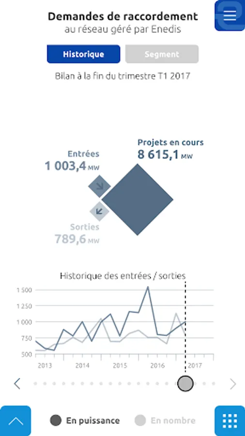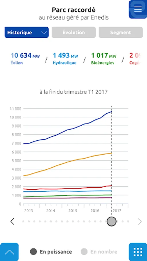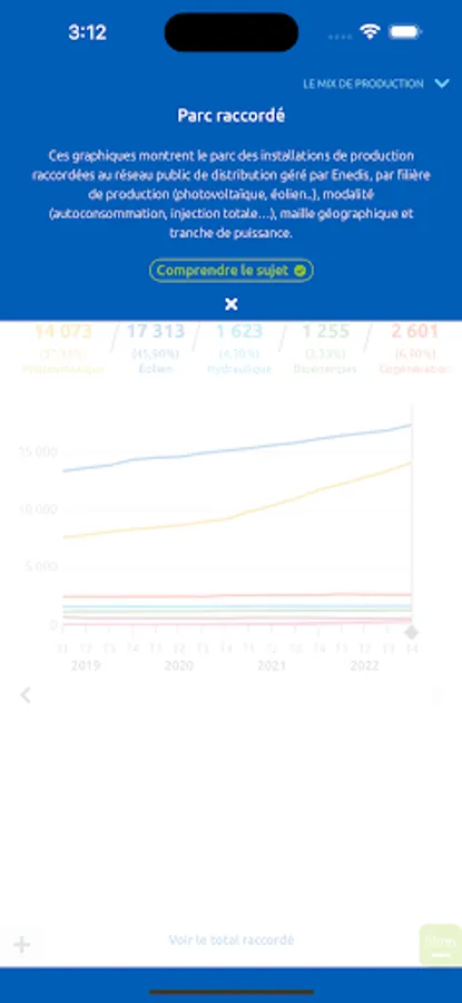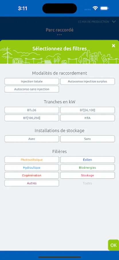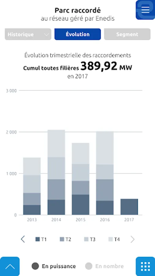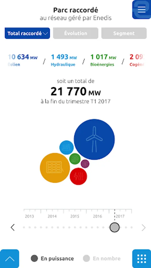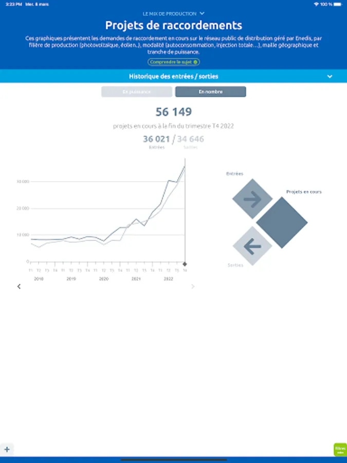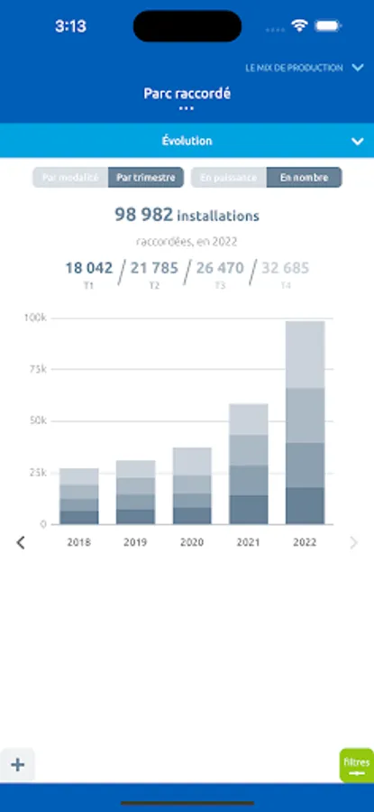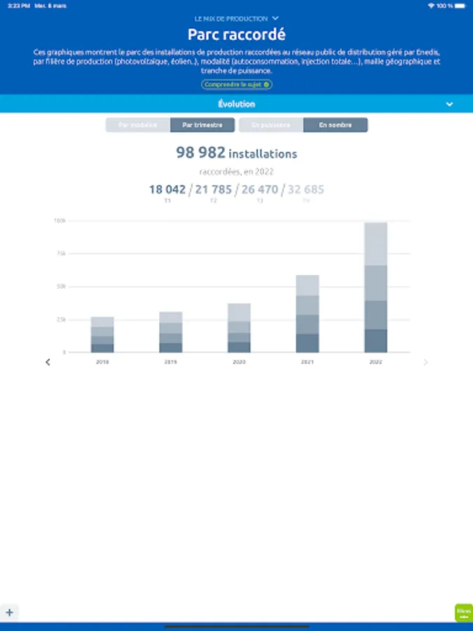 The panorama of the production facilities shows the number and power of the connected systems or being connected to the public distribution network managed by Enedis.