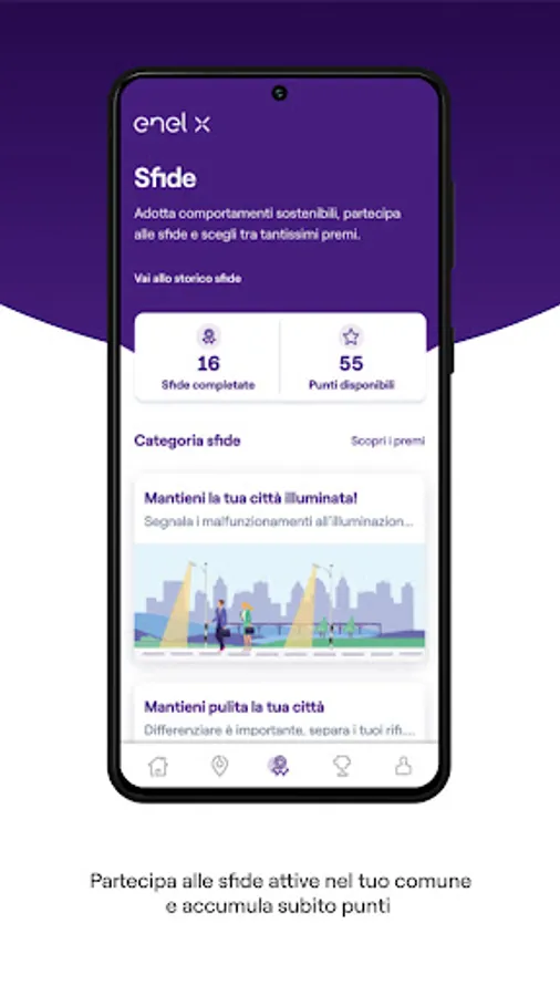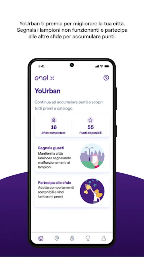 Enel X YoUrban is the new and innovative Public Lighting Failure management service, which allows you to report and follow up on the resolution of failures relating to Public Lighting in the Municipality where you are located, provided that it is managed by Enel X. The app also allows you to participate in sustainability challenges to actively contribute to the improvement of the city, accumulating points and accessing a large catalog of prizes.