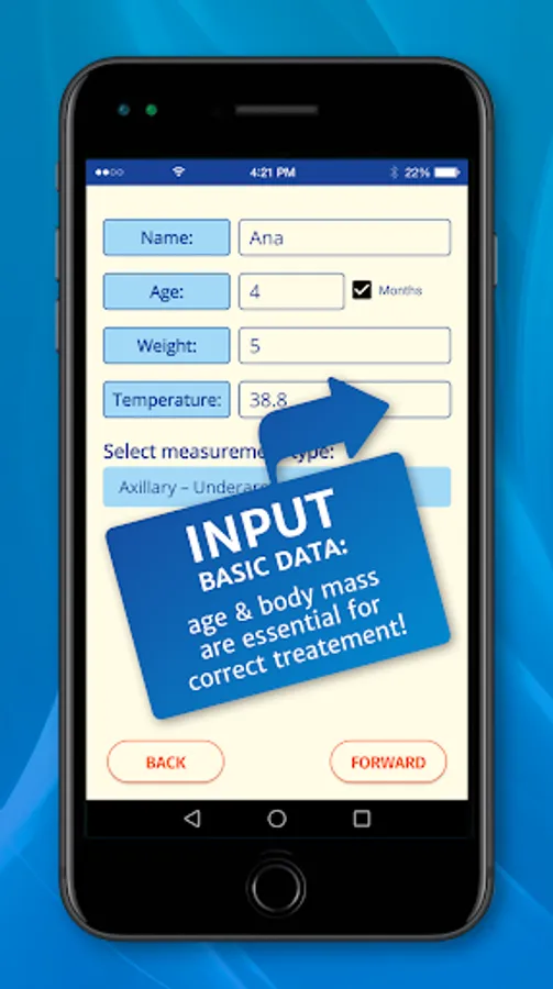 Also you need to input some personal data. The age of an ill person is extremely important for the right course of action – and it can be input either in months (for babies and toddlers), or in years (for older children or adults). Body mass is another important fact.