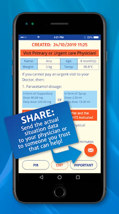 And for your peace of mind: you can send (by e-mail) all the input data, with treatment suggestion, to your doctor, or any other person you trust which can help, or which can assure you that the home care steps and medicine you have applied were right and appropriate!