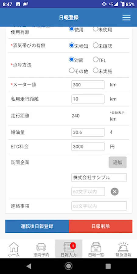 The "ENEOS Operation Management Service" is a smartphone application that mainly allows you to make vehicle reservations, create daily driving reports, make emergency calls, receive various notifications, and view PDF documents. This is a service that allows you to centrally manage daily driving reports on the cloud.