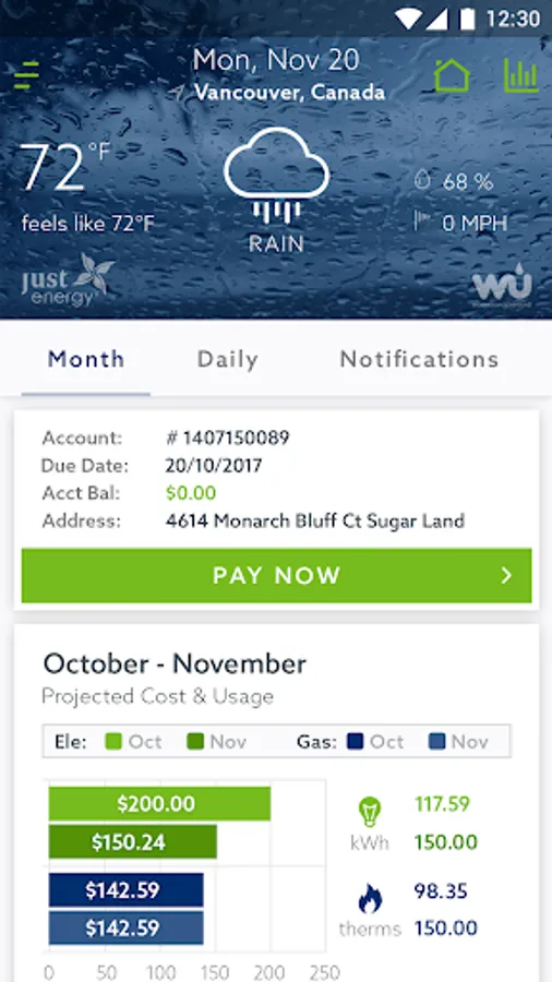 The Just Energy Advisor app uses sophisticated algorithms to provide users with energy bill projections based on local weather forecast and historical energy usage.