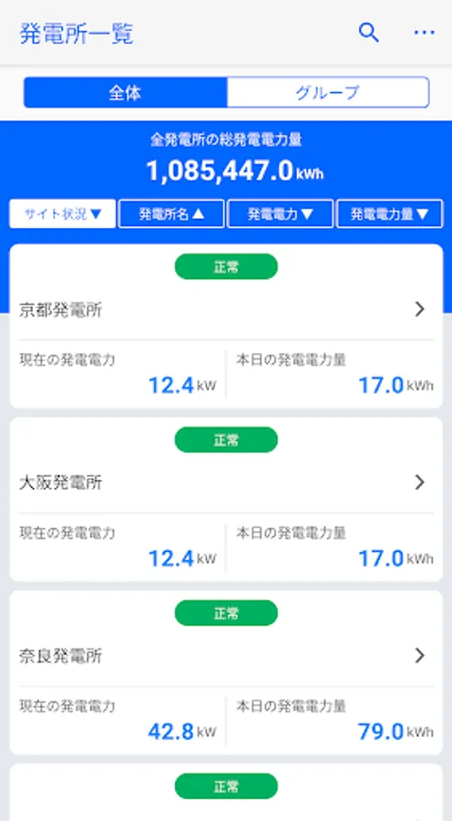サイトの一覧や合計の発電電力量を表示したり、サイトごとの現在の発電状況、またその推移をグラフで表示します。