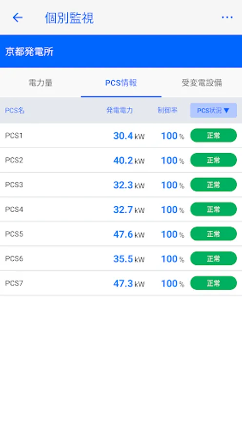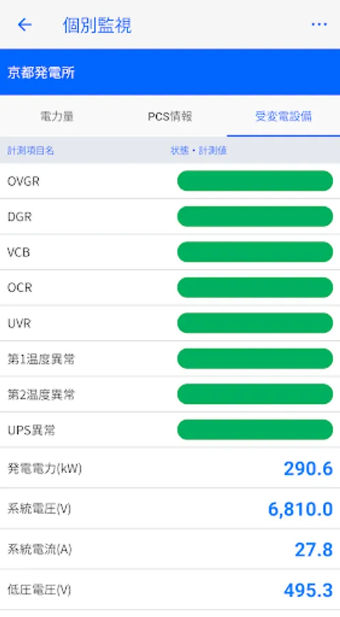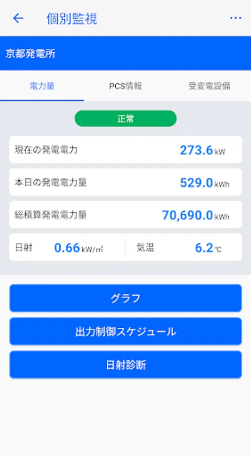 またサイトで計測している日射や気温、PCSごとの発電電力、受変電設備の状況についても閲覧することができます。
