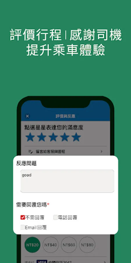 功能包括免費下載、機場接送、包車、預約用車、安心簡訊、分享旅程、司機評價、折扣優惠、女司機、微搬家、觀光、新車、英語、日語等多樣化服務。