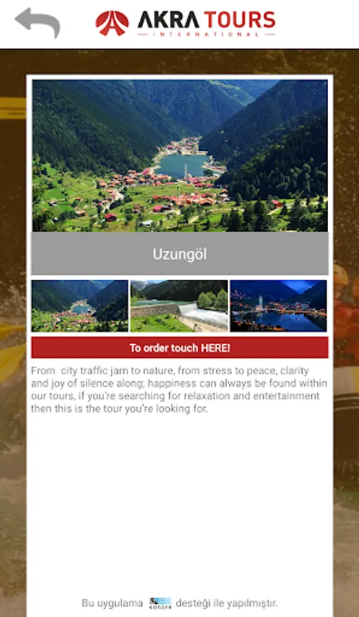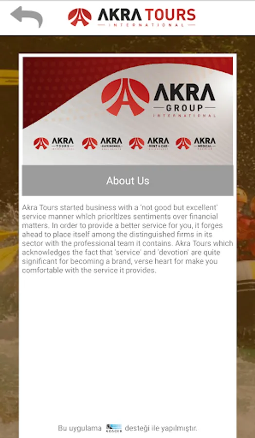 Akra Tours started business with a 'not good but excellent' service manner whlch priorltlzes sentiments over financial matters. In order to provide a better service for you, it forges ahead to place itself among the distinguished firms in its sector with the professional team it contains. Akra Tours which acknowledges the fact that 'service' and 'devotion' are quite significant for becoming a brand, verse heart for make you comfortable with the service it provides.