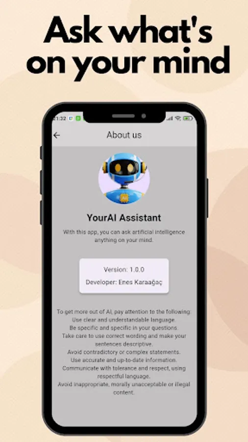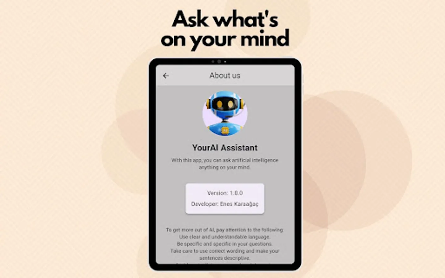 YourAI Assistant is the ideal solution for asking questions on different topics (information, entertainment, sports, health, etc.). You can use our app to ask anything you are curious about and get fast and accurate answers.