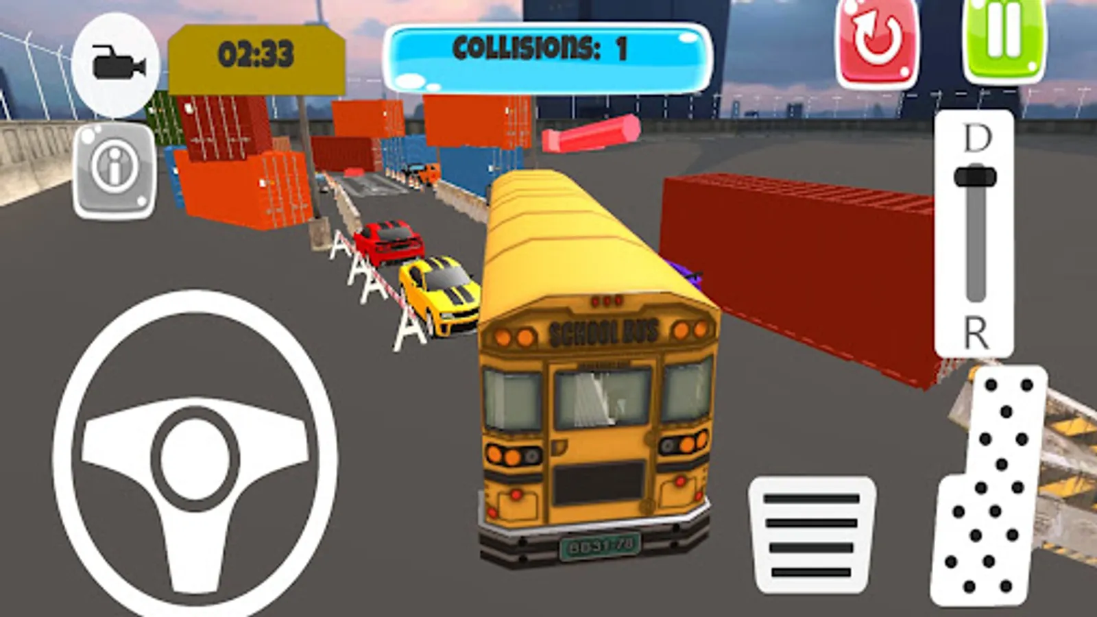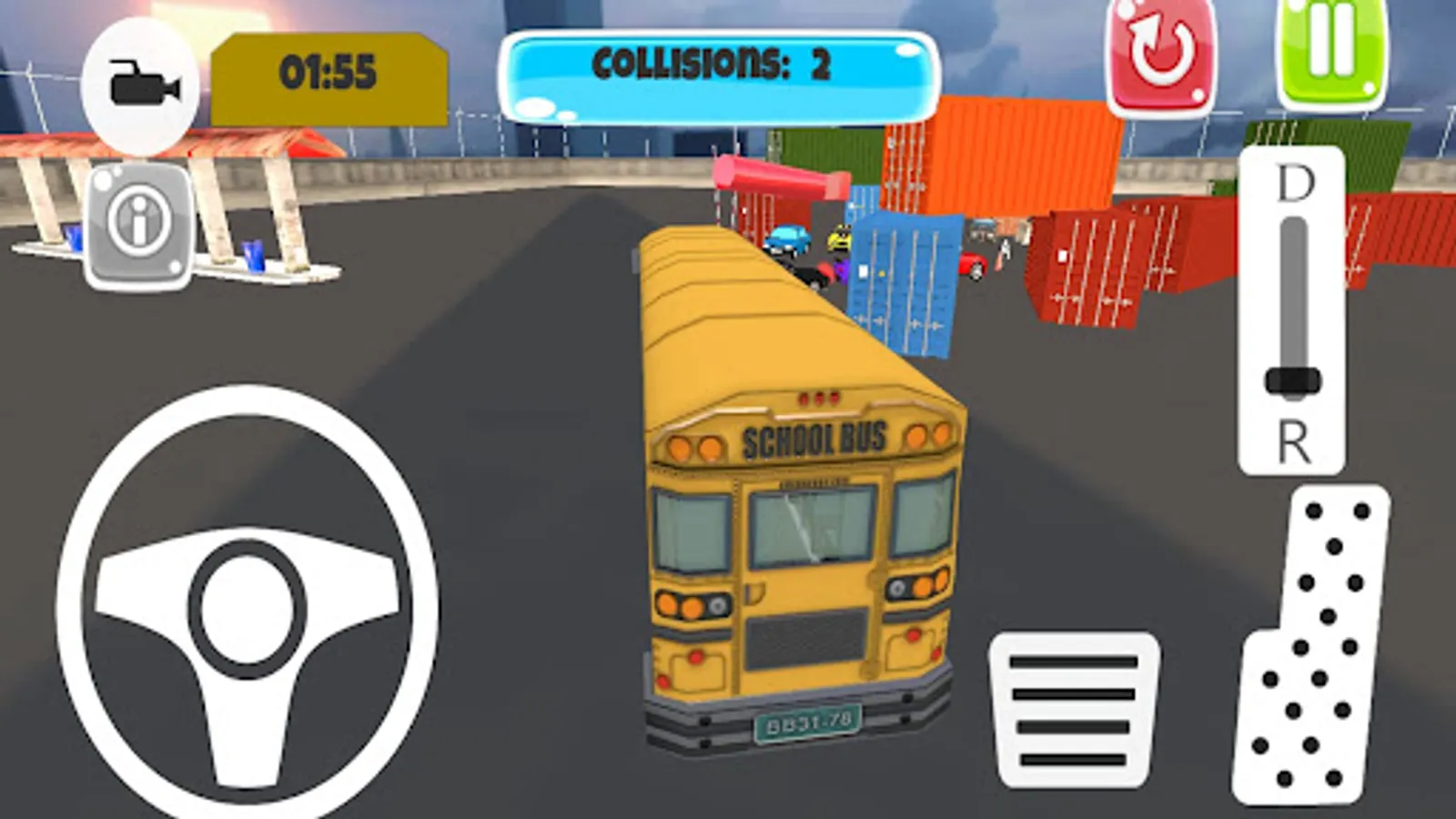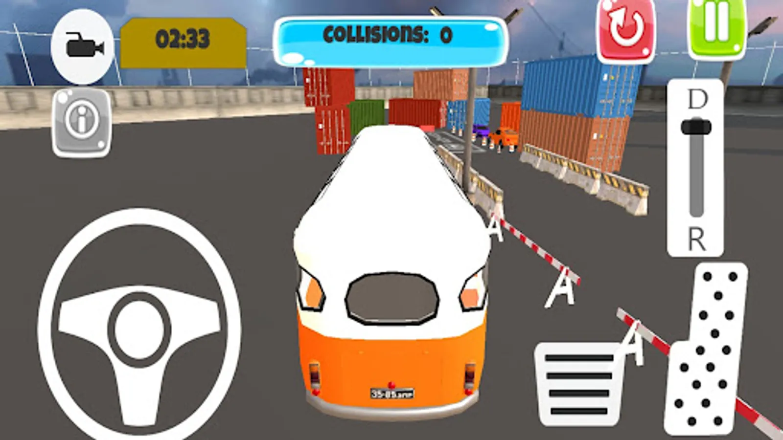Bus Parking Simulator 3D is a game where you have to park two different single-story buses in a certain amount of time. The game includes cars, containers and other obstacles. There are 30 different levels in the game and the length of the parking areas and the number of obstacles increase in each level. Test your parking skills now with Bus Parking Simulator 3D!
