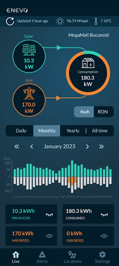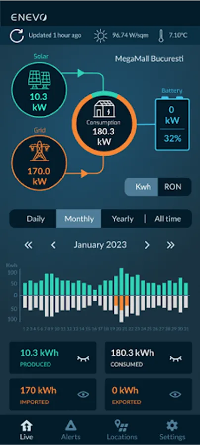 Energy production and consumption reports for customers using green energy products provided by Enevo Group.