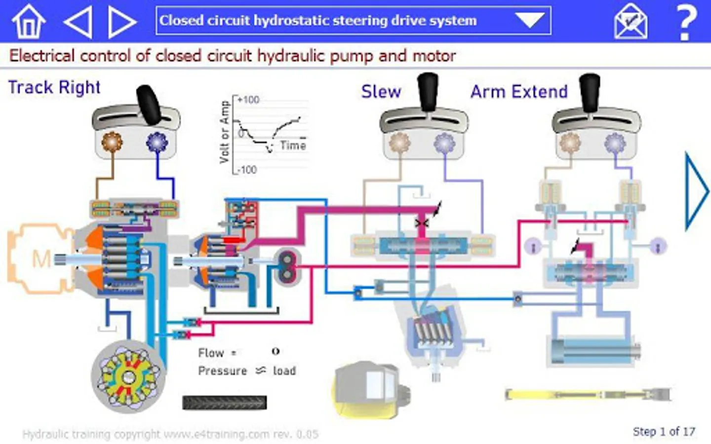 This virtual hydraulic excavator lets your drive, operate, explore the systems, maintain, and diagnose faults. It will help you to learn about fluid power safely and effectively. The program lets you operate drive, boom, and slew controls then explore the components that make them work. The best way to learn is by experimentation. It includes an example hydrostatic drive circuit with information and exercises that show you how to maintain and diagnose common faults.