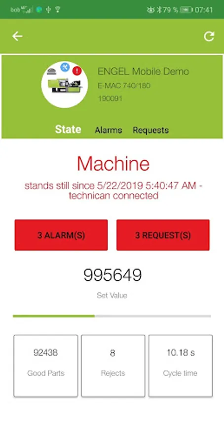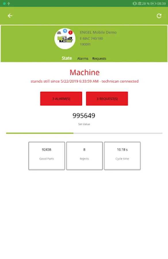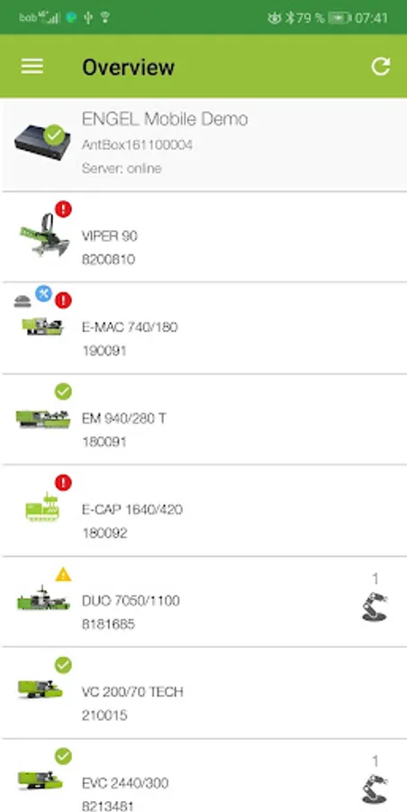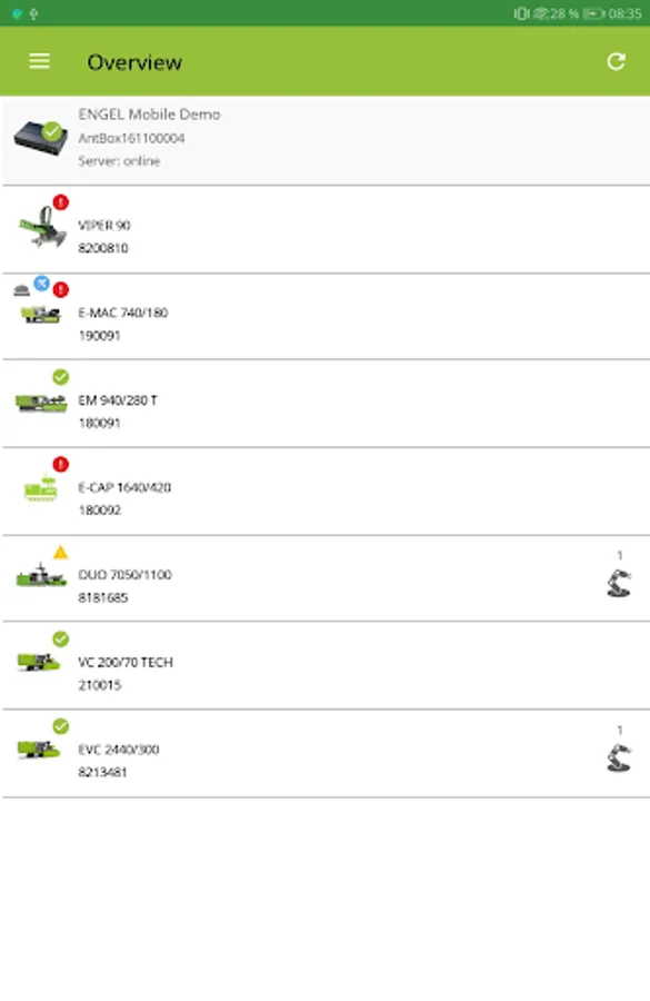 Get an overview of the current machine and production status of your machinery as well as of all pending alarms or use the notification service of the app in case of status changes.