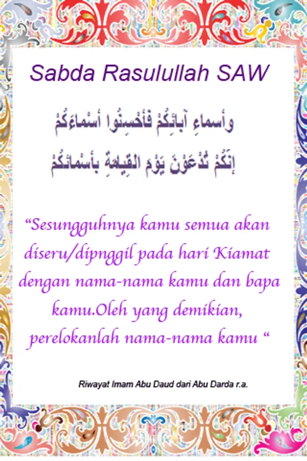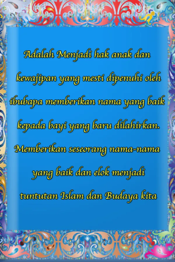 Adalah menjadi hak anak dan kewajipan yang mesti dipenuhi oleh ibubapa memberikan nama yang baik kepada bayi yang baru dilahirkan. Memberikan seseorang nama-nama yang baik dan elok menjadi tuntutan Islam dan budaya kita