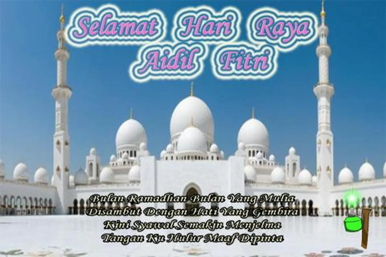 Sampaikan juga salam Hari Raya Aidil Fitri ini kepada semua teman,kenalan,saudara maupun seluruh umat Islam di dunia.Ianya pasti meriah.