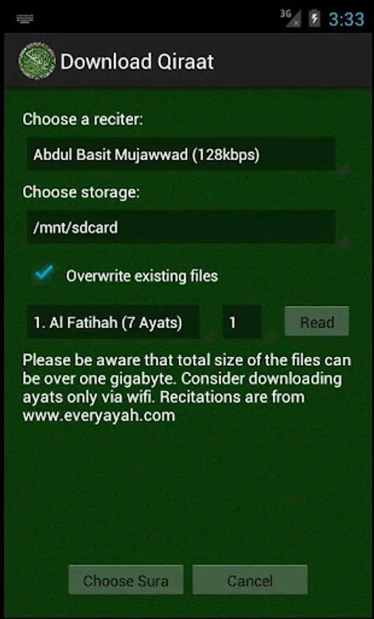The application uses mp3 files from www.everyayah.com. After the installation, also you need to download recications from "Download Qiraat" menu.