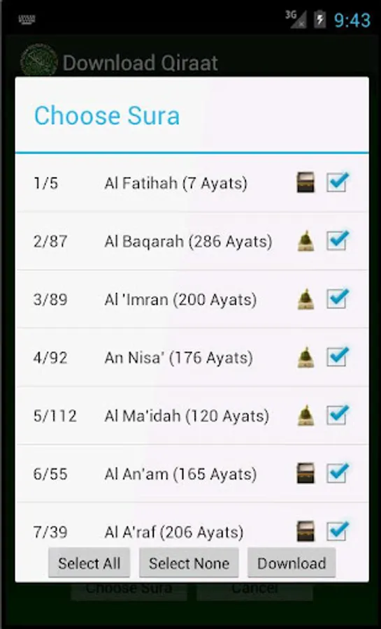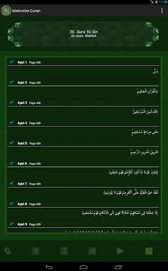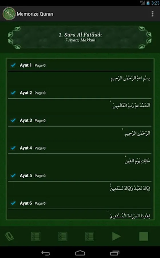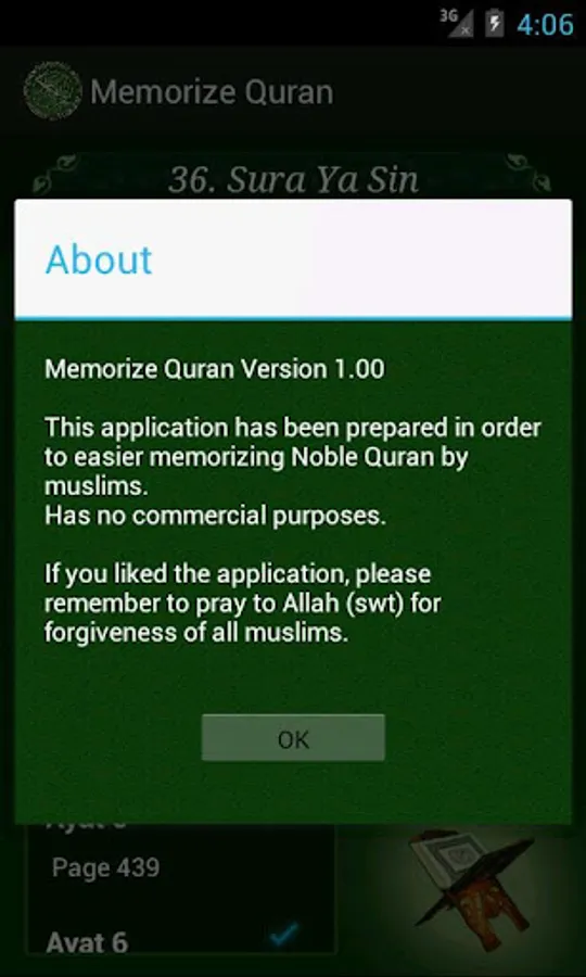 InshaAllah this application will help you memorize Holy Quran. Choose suras from the list which you want to memorize, ayats will be loaded into the recitation list, at the end choose the ayat range to recitate. Chosen ayats will be recited continously till you memorize them.