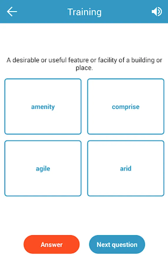 ✔ Word Training. You can also train for a set of words to see how well you master them. The difference between training and testing is that during training you won't be "penalized" if you get some wrong answers. This allows you to practice words for the real IELTS exam without any pressure.