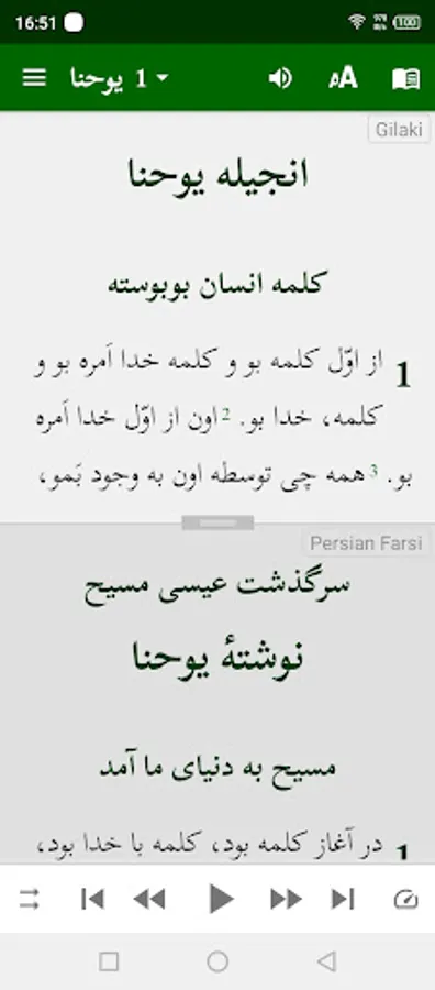 - "verse by verse" to display a verse in Gilaki followed by the same verse in English or in one of the other versions you may choose.