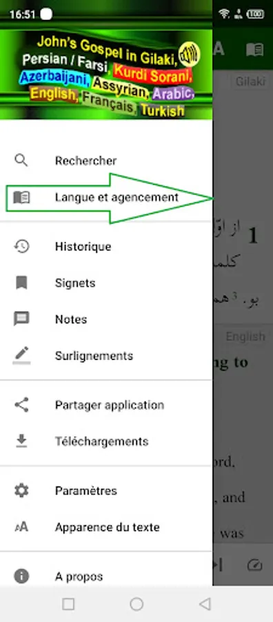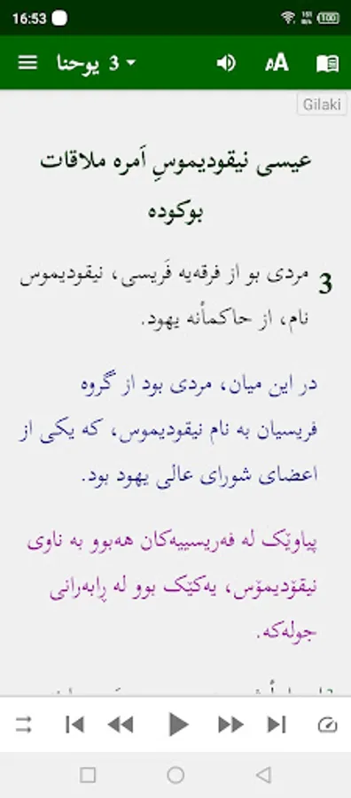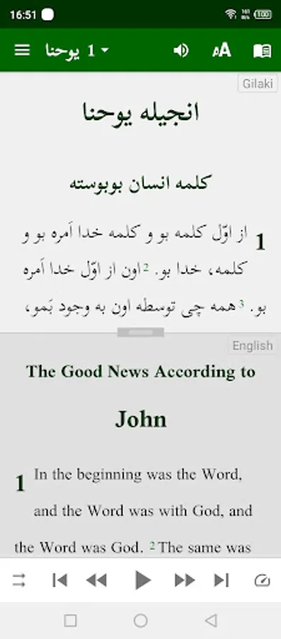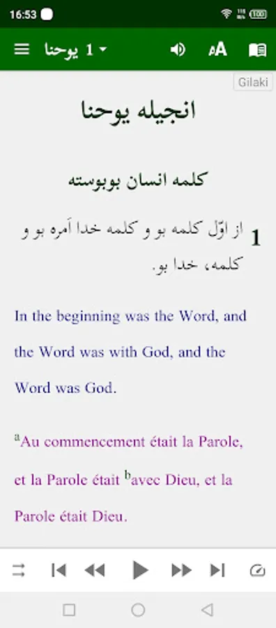 This application presents the Word of God in several languages: 1) John's Gospel in Gilaki, 2) Persian / Farsi, 3) Kurdi sorani, 4) Azerbaijani 5) Assyrian, 6) Arabic, 7) English, 8) French, 9) Turkish