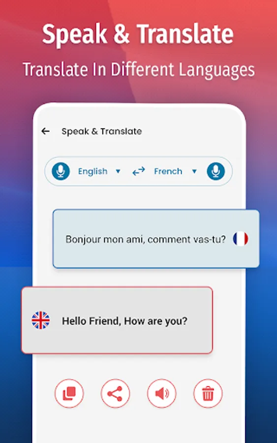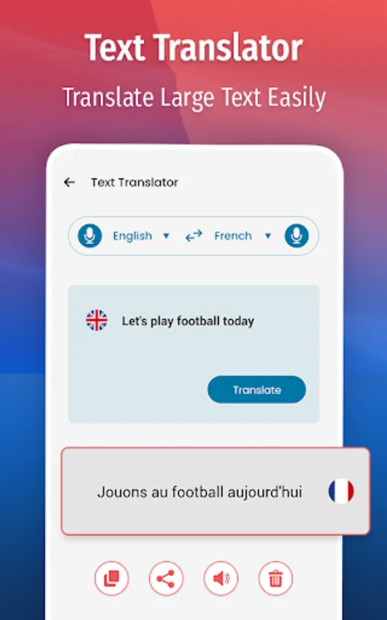 π French chat translator with French English translator app gives you permission to copy, and share text with others.