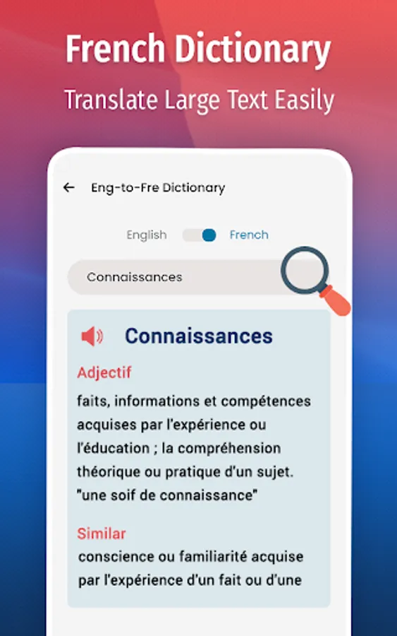 French Dictionary app helps users to learn and improve their vocabulary. Learn French by using the English language with the help of this French English Dictionary. The English to French Dictionary feature of this French Chat translator is very helpful for those users who want to improve their language skills.