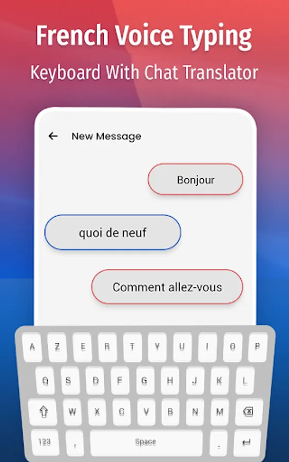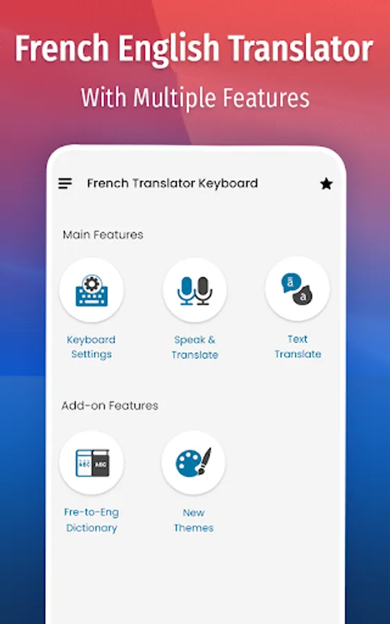 French to English translator and French translator keyboard helps users to type text in French and convert it into any language. French chat translator keyboard is made for French speakers, who want to learn French. French English translator helps users to type text into any language and translate with Speak & translate feature to your desired language. French to English translator and French Voice keyboard help users to type text quickly with the help of a Speech to text converter.