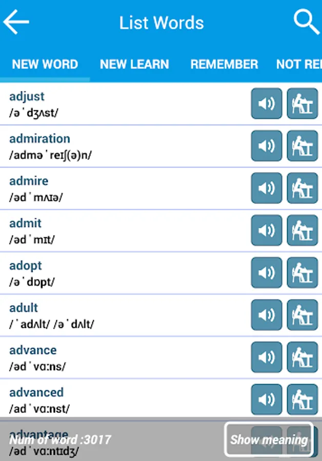 This App also give many fantastic function to help you learn word faster and remember word longer with many kind of vocabulary quiz . (4 quiz english : Show Meaning - Choose Word, Show Word - Choose Meaning,Show Meaning-Complete Word, Listen - Complete Word)