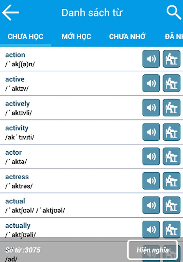 + No learning: list of words you've learned. you will see this list from any known then click on the icon to toggle learned from. with unknown words you can click on a word to see more from the school and conduct.
