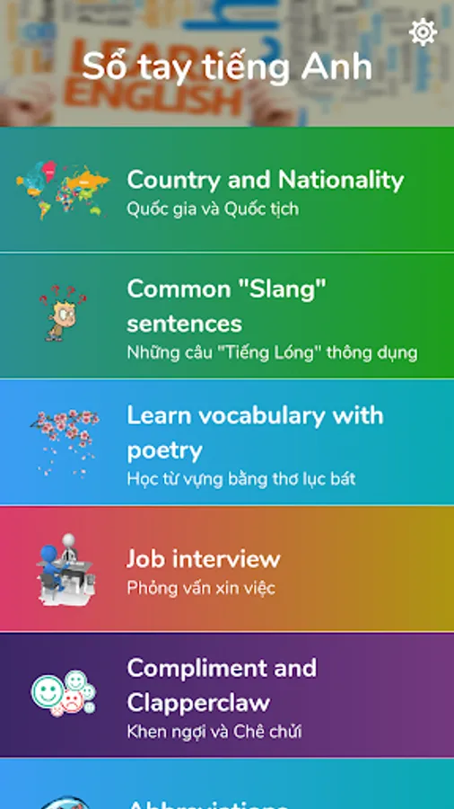 Are you a person who is learning English, like traveling abroad, interviewing beautiful things ...? ... Whatever the case, there will be situations that confuse you and forget you need to do. What and what to say to the other person. Maybe you forgot your vocabulary or forget some basic communication, ... Do not worry, now there is the application "English manual", it is a simple English handbook. And also a best friend is always with you to remind you.