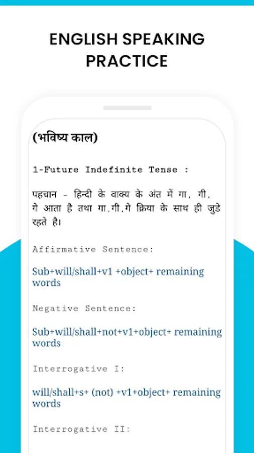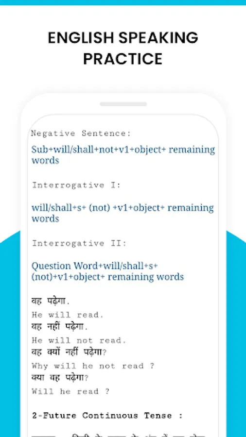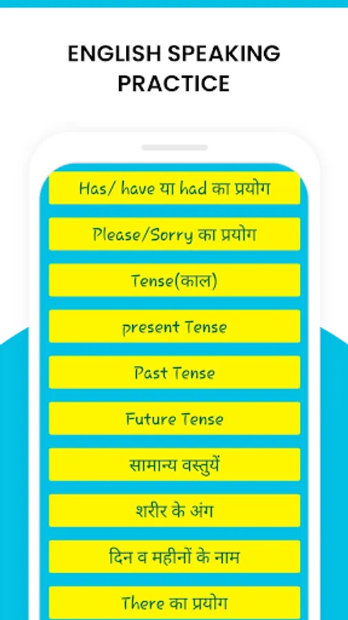 This app also contains examples of daily usable sentences in hindi and English for your English speaking practice.