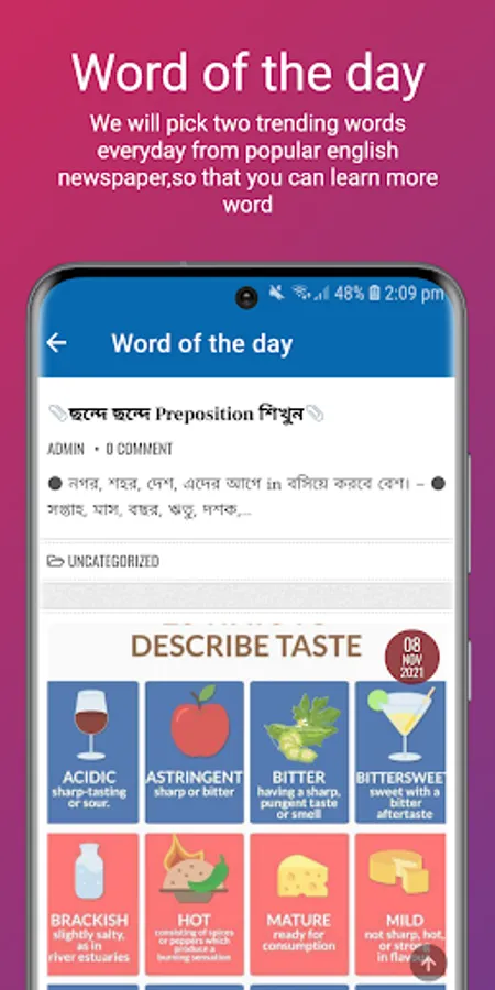 In this English To Bengali Dictionary we added a quiz system so that you can judge yourself how much word you learned.
