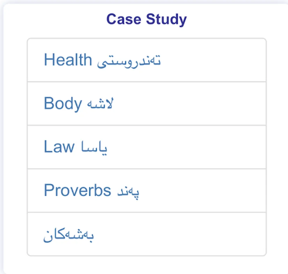 ئێمە ملیۆنەها ووشە، ڕستە ئاخاوتن، گوێگرتن ڕێنووس، وێنە، نمونە و وەرگێڕی گشتی دابین دەکەین