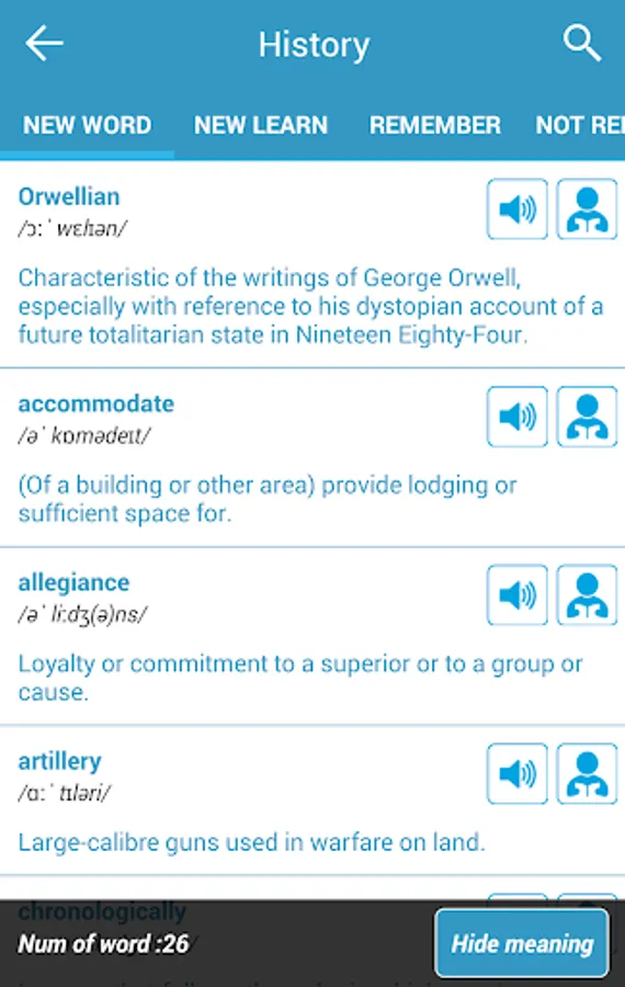 ✔ Daily New Words. The only way to truly learn is persistence! The app helps you learn every day by teaching you some new words. It will also show a push notification to remind you that it is time to study. You can change the number of daily new words show in the app settings. For extra help you can enable an online spell-checker to verify words as you type them.