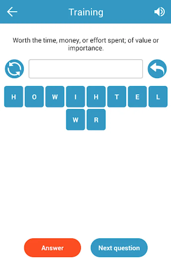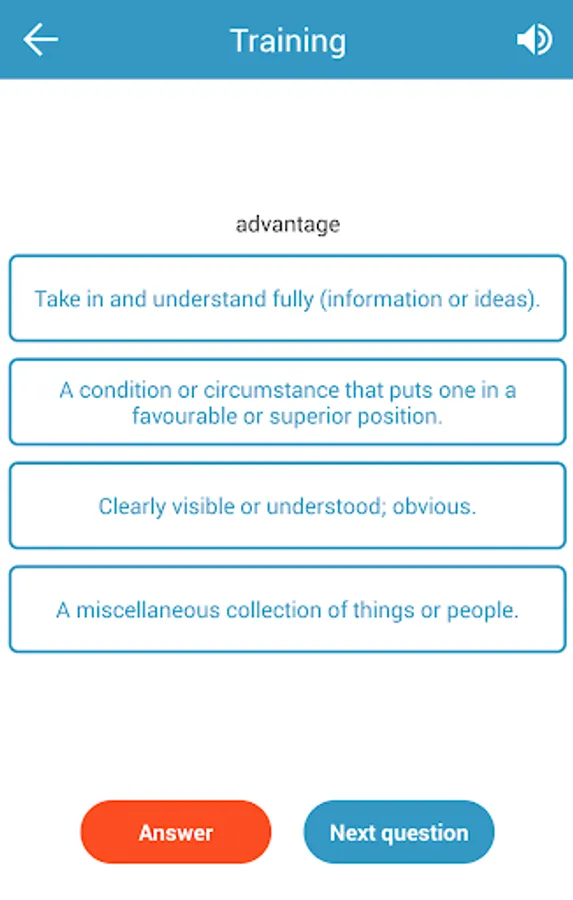 ✔ Word Training. You can also train for a set of words to see how well you master them. The difference between training and testing is that during training you won't be "penalized" if you get some wrong answers. This allows you to practice words for the real for International test without any pressure.