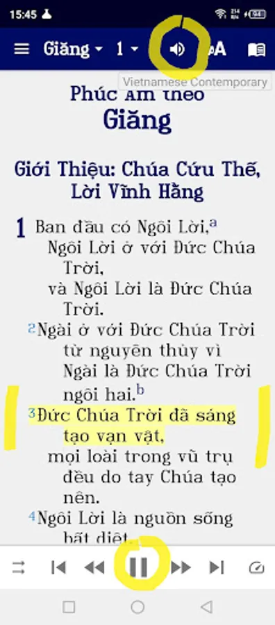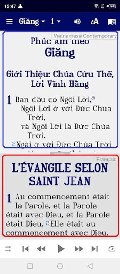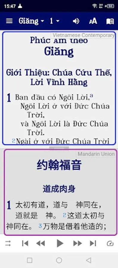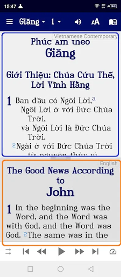 - "verse by verse" to display a verse in Vietnamese followed by the same verse in one of the other languages of your choice.