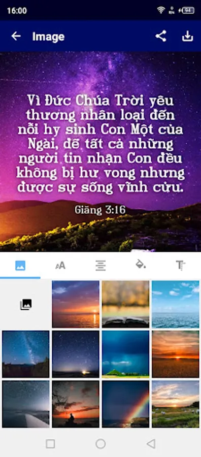 • When you tap on a verse, an image button is shown on the bottom toolbar. When this button is pressed, the ’Edit image’ screen appears. You can choose the background image, move the text around the image, change the font, text size, alignment, format and color. The finished image can be saved to the device and shared with others.