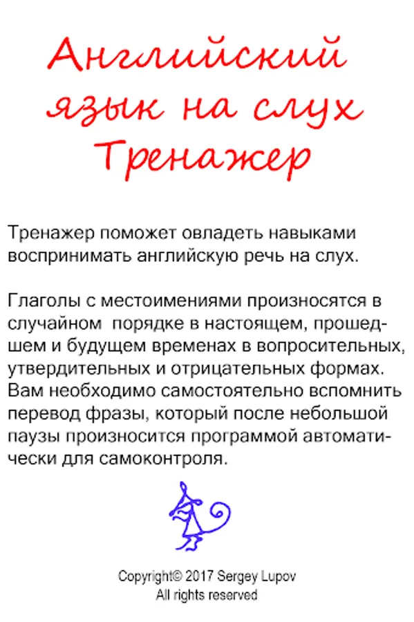 Verbs in combination with subjective pronouns are pronounced randomly in the present, past and future tenses in interrogative, affirmative and negative forms. You must independently recall the translation of the phrase, which after a short pause is pronounced by the program automatically for self-control.
