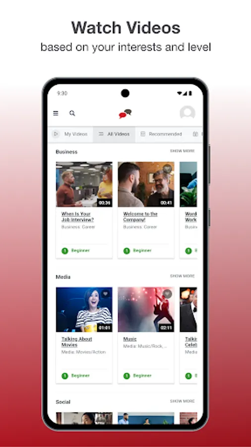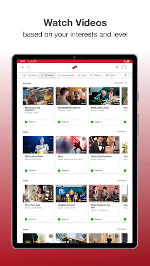 - Watch a video a day with subtitles, recommended based on your level and interests.